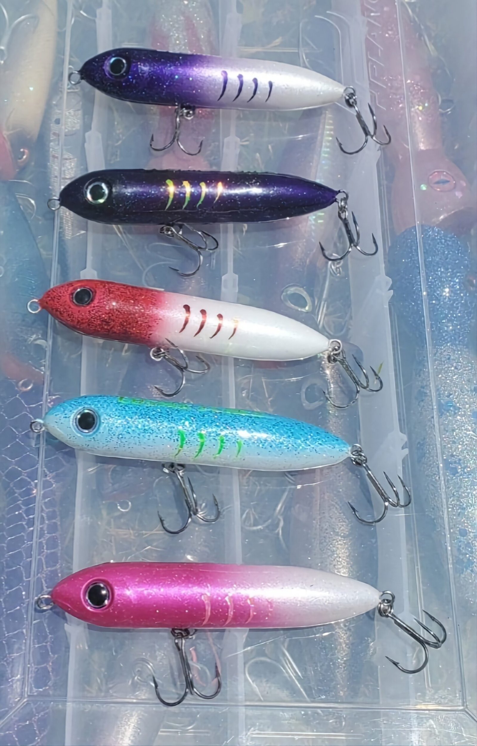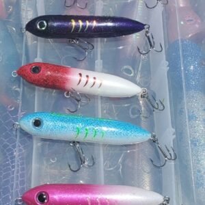 Add even more fun to Topwater fishing with exciting new colors.  These walk the dog Spook style topwater lures are handpainted with vibrant, attractive colors and holographic accents.  Paired with VMC hooks and Spro Power split rings.